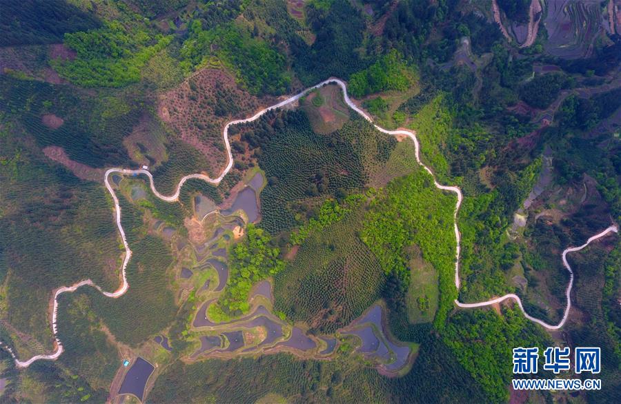 這是融水苗族自治縣桿洞鄉(xiāng)黨鳩村烏英苗寨的公路(4月18日無人機拍攝)。新華社記者黃孝邦攝