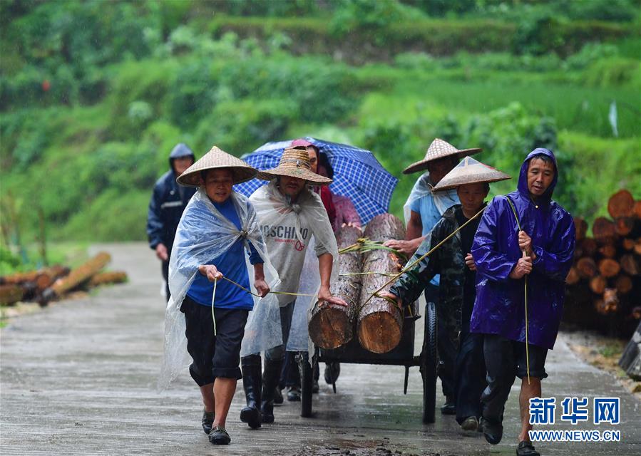 在烏英苗寨,村民在雨中搬運木頭,準備修建新房(7月6日攝)。新華社記者黃孝邦攝