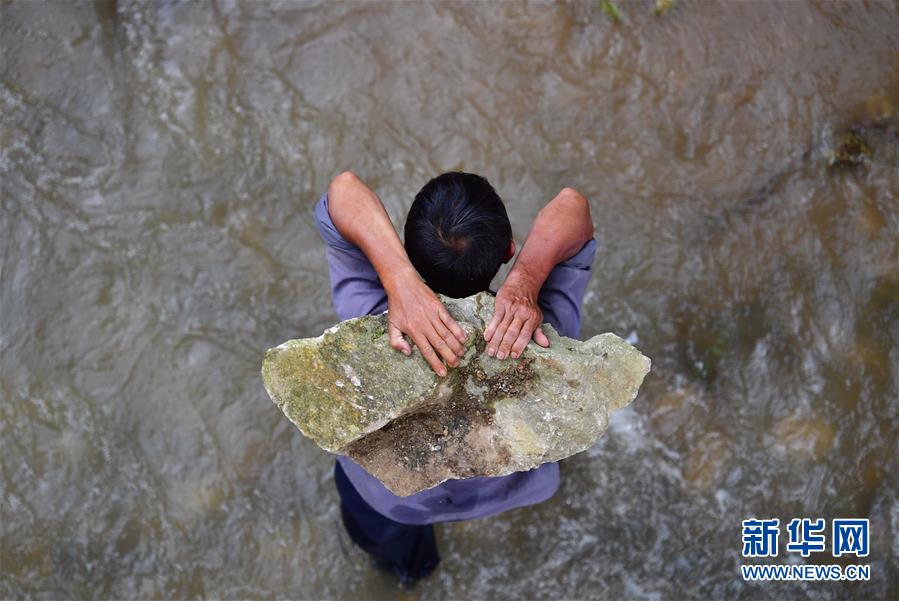 村民在烏英苗寨搬運石頭,維修河堤(7月2日攝)。
