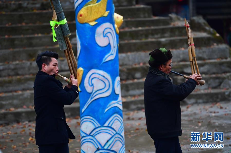 烏英苗寨村民在新蘆笙柱下吹蘆笙(12月22日攝)。新華社記者黃孝邦攝
