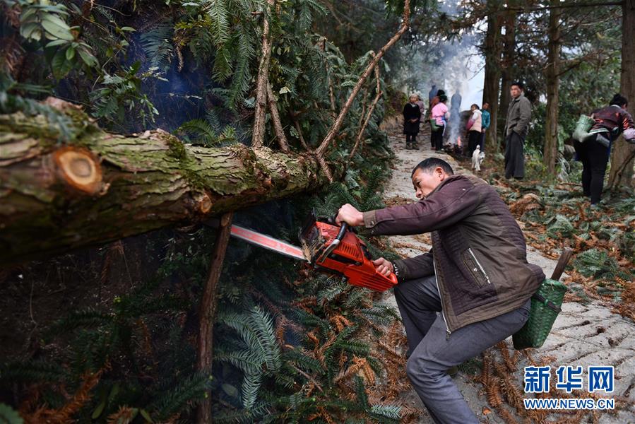 烏英苗寨村民合力抬木頭下山,準備制作蘆笙柱(12月2日攝)。新華社記者黃孝邦攝