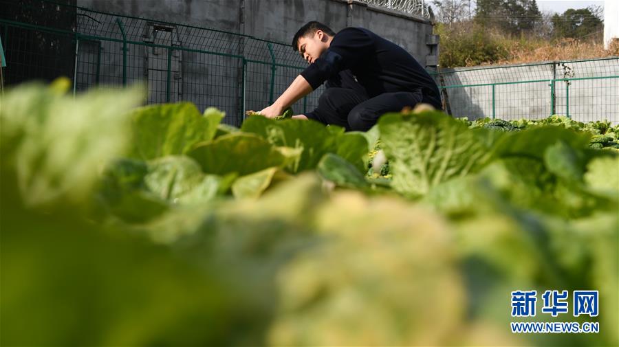 金寨火車站派出所民警呂錦鵬在菜園摘菜(12月19日攝)。由于金寨火車站派出所離縣城較遠(yuǎn),平時(shí)買菜不方便,民警們?cè)谠鹤永镩_(kāi)墾了一處小菜園。新華社記者張端攝