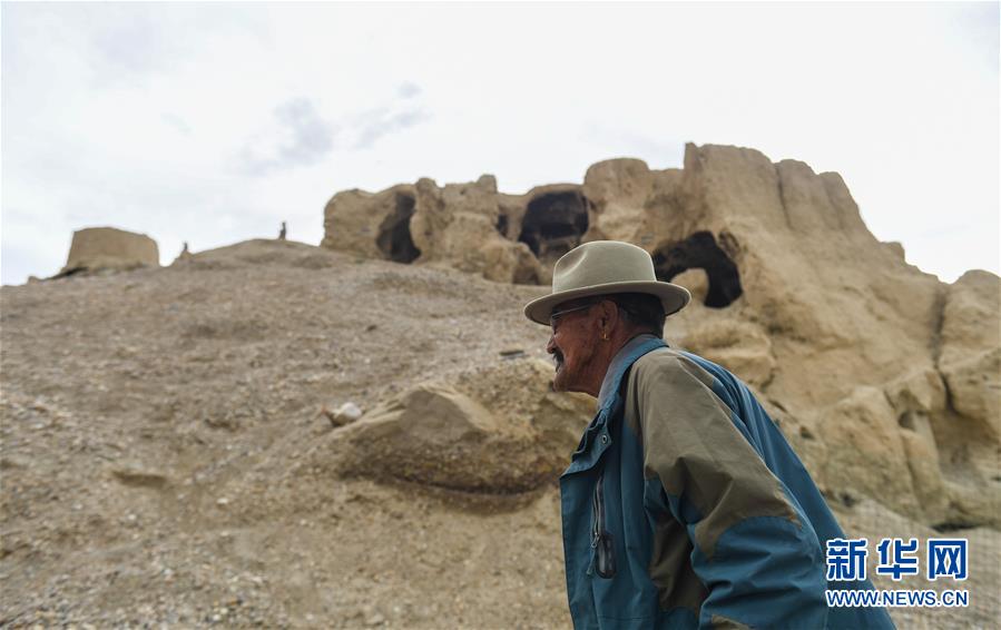 76歲的達瓦次仁走過古格遺址前的洞窟,這里曾是他的家(7月30日攝)。新華社記者晉美多吉攝