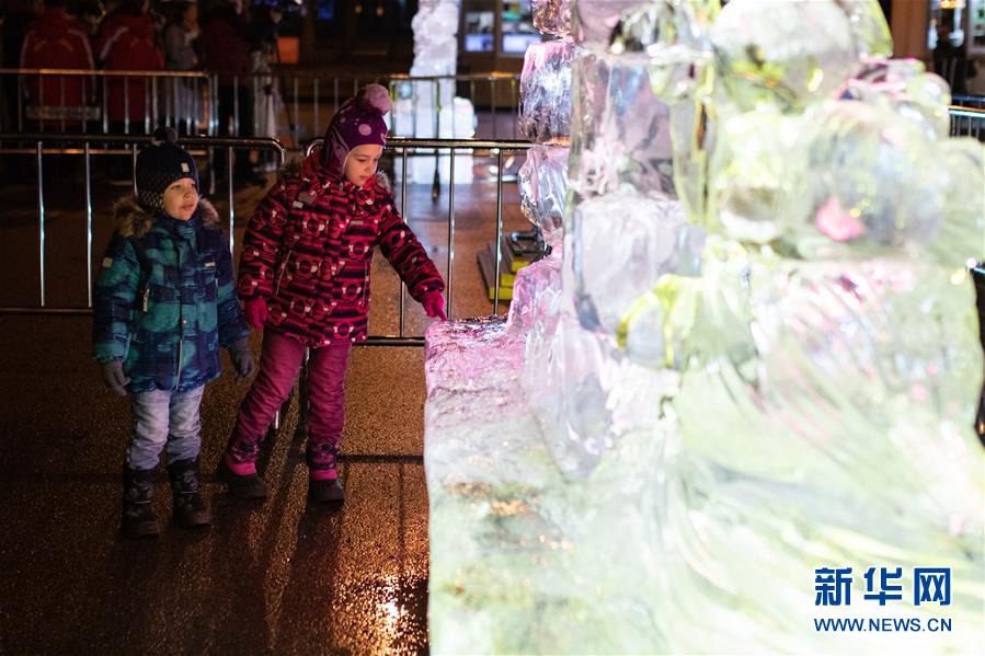 12月24日,在俄羅斯首都莫斯科,小朋友參觀冰雕藝術(shù)展。 新華社記者 白雪騏 攝