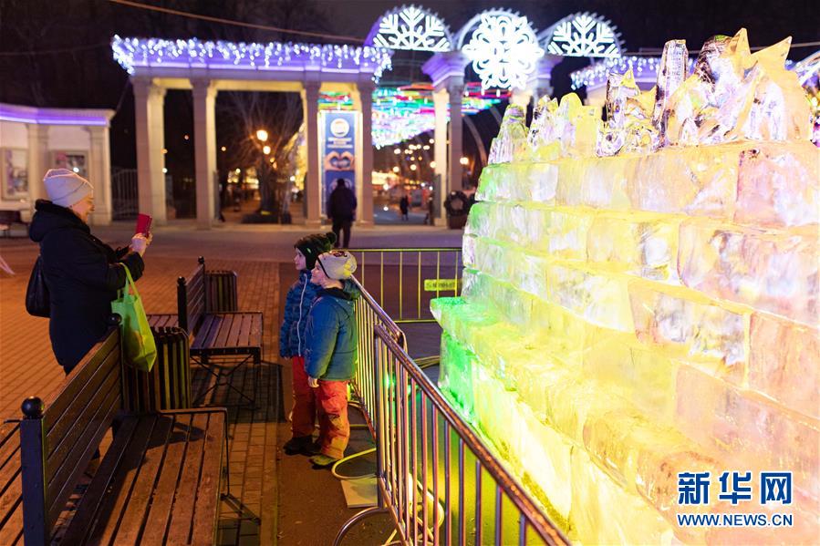12月24日,在俄羅斯首都莫斯科,小朋友們與冰雕合影。  新華社記者 白雪騏 攝
