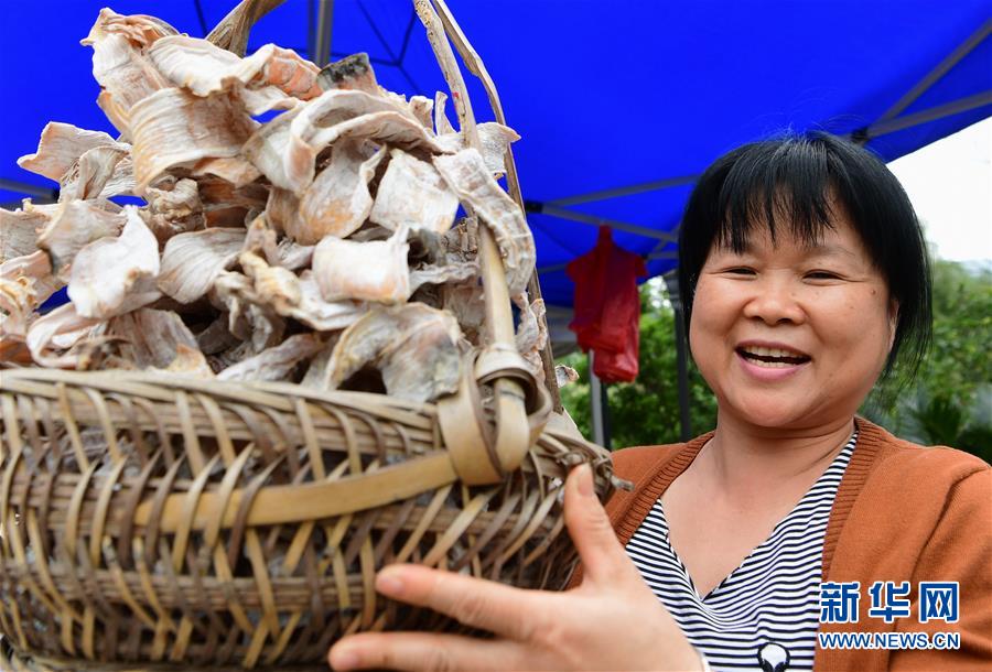在龍巖市永定區(qū)湖坑鎮(zhèn)南江村停車場(chǎng),村民王贈(zèng)娘展示自己生產(chǎn)的筍干。從事涉旅行業(yè)后,她的年收入從原來(lái)的七八萬(wàn)元增加到20多萬(wàn)元(5月4日攝)。新華社記者魏培全攝