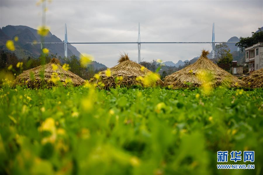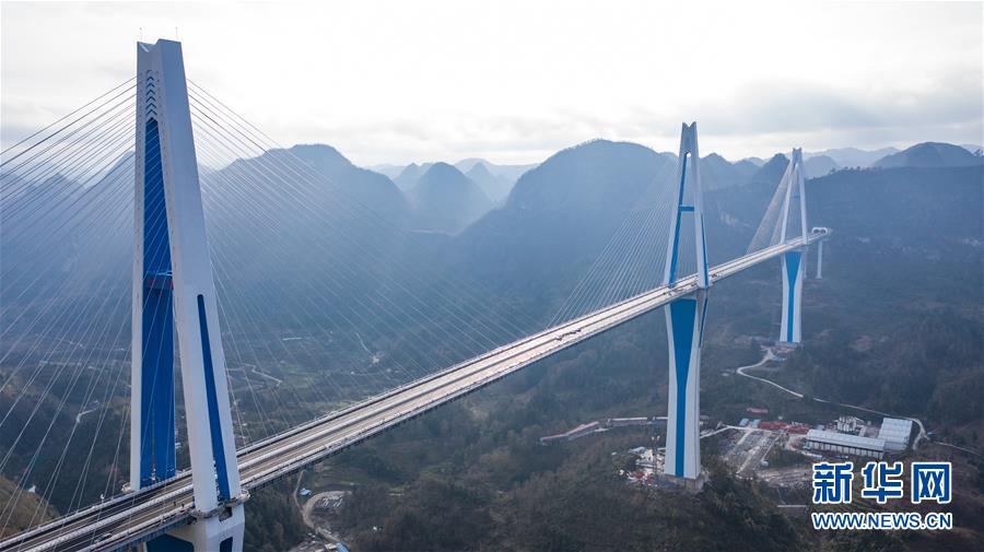2019年1月7日無人機(jī)航拍的平塘特大橋橋塔全景,中為高332米的世界第一高混凝土橋塔。新華社記者歐東衢攝