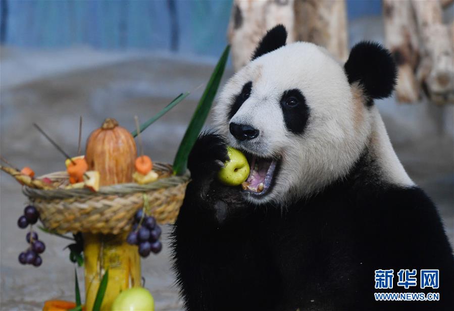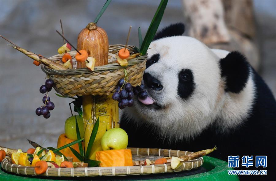 當(dāng)日是2019年最后一天,海南熱帶野生動(dòng)植物園的工作人員為園區(qū)內(nèi)大熊貓“貢貢”“舜舜”準(zhǔn)備了用葡萄、南瓜、竹筍等果蔬制作的“火鍋串串香”,讓它們用“擼串”的方式迎接新年的到來(lái)。 新華社記者 楊冠宇 攝