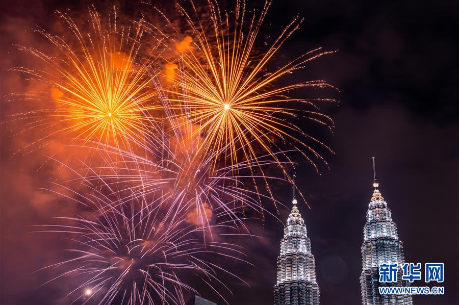 2020年1月1日,焰火在馬來(lái)西亞吉隆坡的馬來(lái)西亞國(guó)家石油公司雙塔旁綻放,迎接新年的到來(lái)。新華社記者朱煒攝