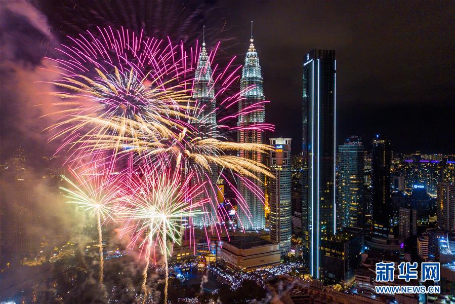 2020年1月1日,焰火在馬來西亞吉隆坡的馬來西亞國(guó)家石油公司雙塔旁綻放,迎接新年的到來。新華社記者朱煒攝