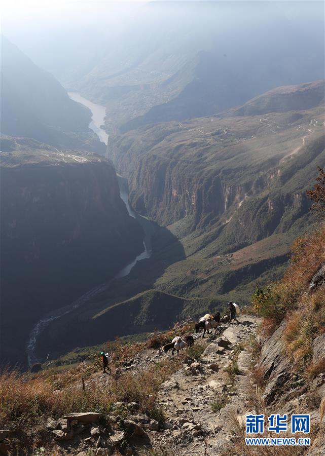 阿布洛哈村村民牽著馬馱運物資到村子里(2018年11月17日攝)。新華社記者江宏景攝