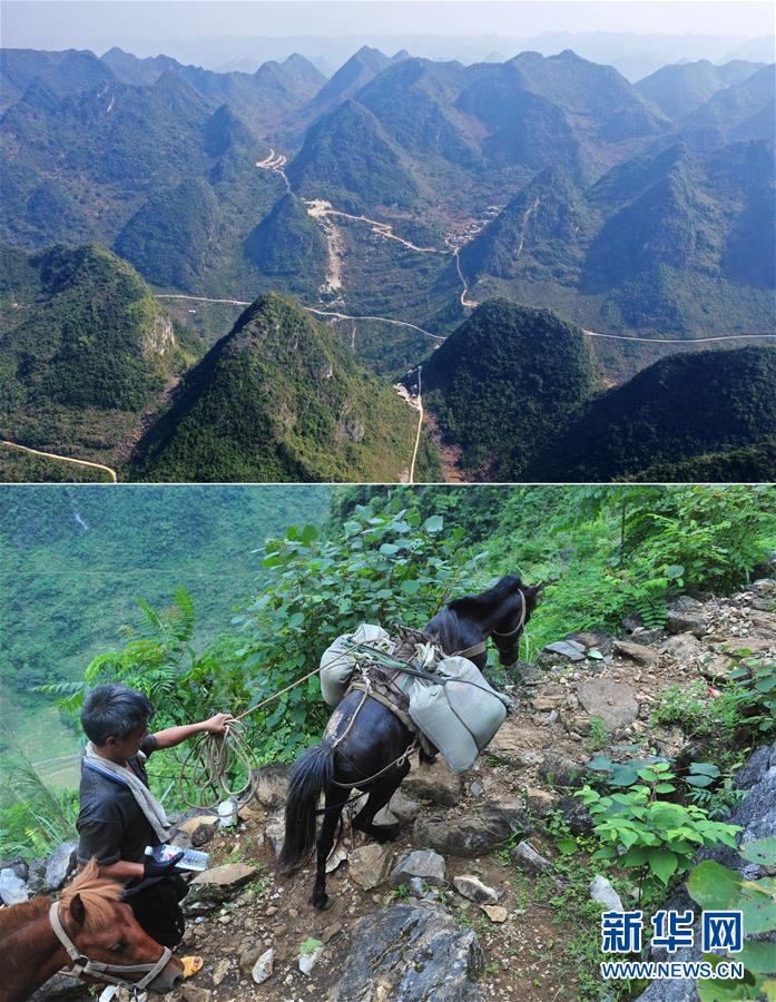 拼版照片:上圖為已經(jīng)修通公路的大化瑤族自治縣板升鄉(xiāng)弄勇村弄為屯以及周邊村屯(11月11日無(wú)人機(jī)拍攝);下圖為在弄勇村弄為屯,村民用馬將建筑材料馱回家,用于修建新房(2014年6月18日攝)。