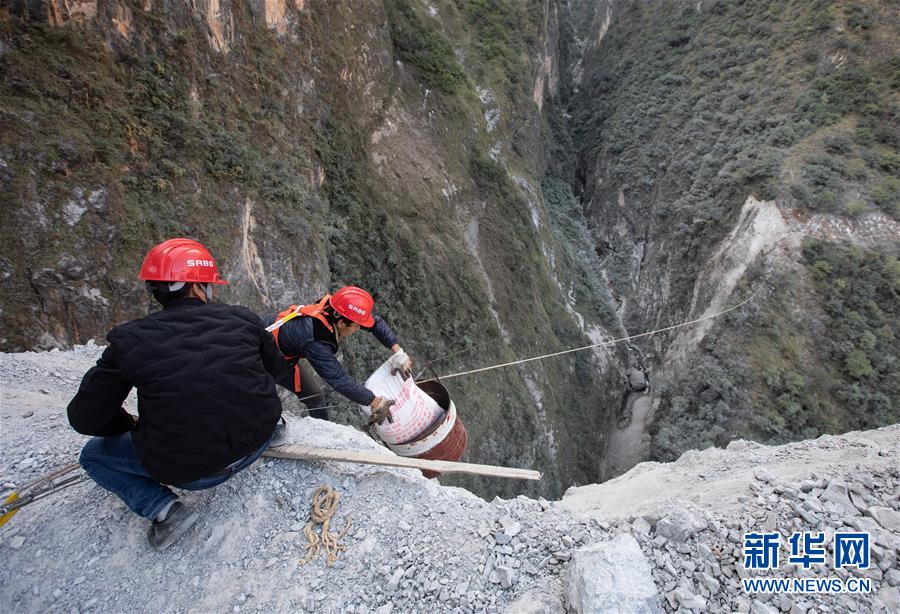 四川路橋的施工人員通過臨時搭建的溜索運輸施工物資到峽谷對岸(2019年11月20日攝)。阿布洛哈村通村公路施工遇到陡崖夾溝地勢,項目進程艱難緩慢,四川路橋施工隊伍開始在峽谷兩端分頭推進。新華社記者江宏景攝
