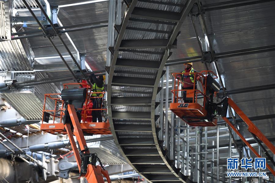 12月31日,施工人員在國家速滑館施工現(xiàn)場安裝最后一塊屋面單元板塊。新華社記者鞠煥宗攝