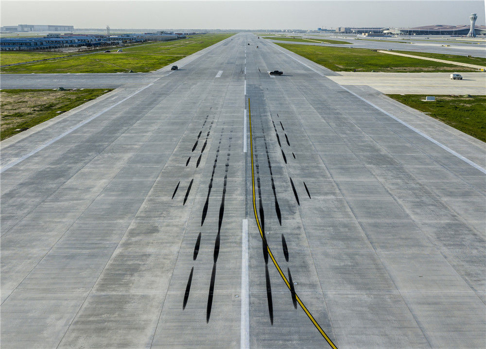 2019年5月29日,北京大興國際機(jī)場,飛機(jī)在跑道上留下的痕跡。馬文曉/視覺中國