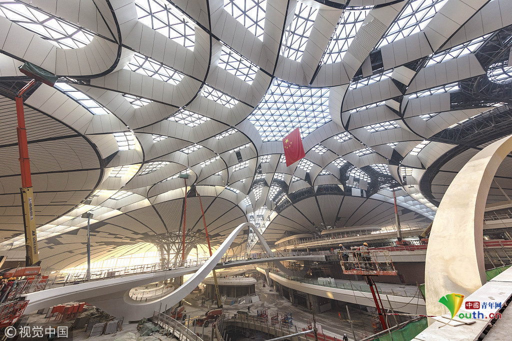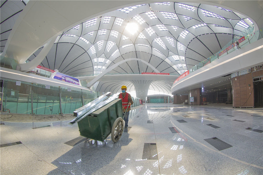 2019年4月26日,北京大興國際機(jī)場將于9月底正式通航。工程建設(shè)進(jìn)入總攻階段,目前,航站樓內(nèi)部裝飾進(jìn)行收尾的工作。武輝/千龍圖像/視覺中國