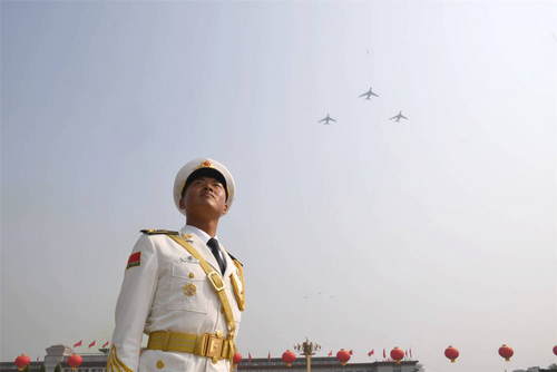 2019年10月1日,慶祝中華人民共和國成立70周年大會在北京天安門廣場隆重舉行。這是空中梯隊(duì)飛過天安門上空。新華社記者金良快攝