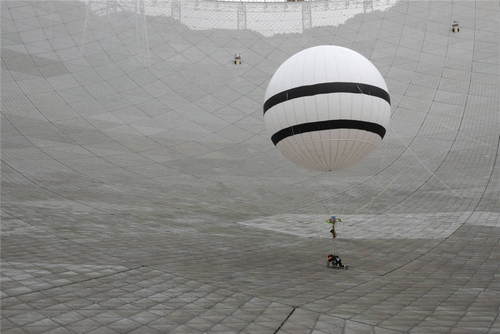 2019年8月30日,在貴州省平塘縣,“微重力蜘蛛人”在500米口徑球面射電望遠鏡(FAST)上進行首次巡檢實驗。FAST調(diào)試組于2017年底開始研制“微重力蜘蛛人”,該方案使用一個直徑7.6米的氦氣球?qū)⒆鳂I(yè)人員體重減少到FAST反射面板能夠承受的重量,使作業(yè)者能夠到達望遠鏡反射面任意地方執(zhí)行巡檢和維護作業(yè)。新華社記者歐東衢攝