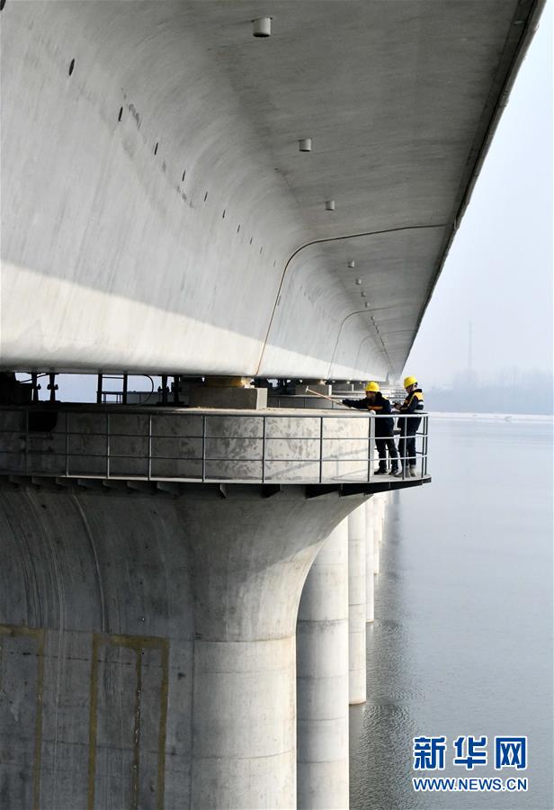 1月3日,中國鐵路濟南局臨沂工務(wù)段工程技術(shù)員在沂河特大橋橋墩上檢查。新華社記者 朱崢攝