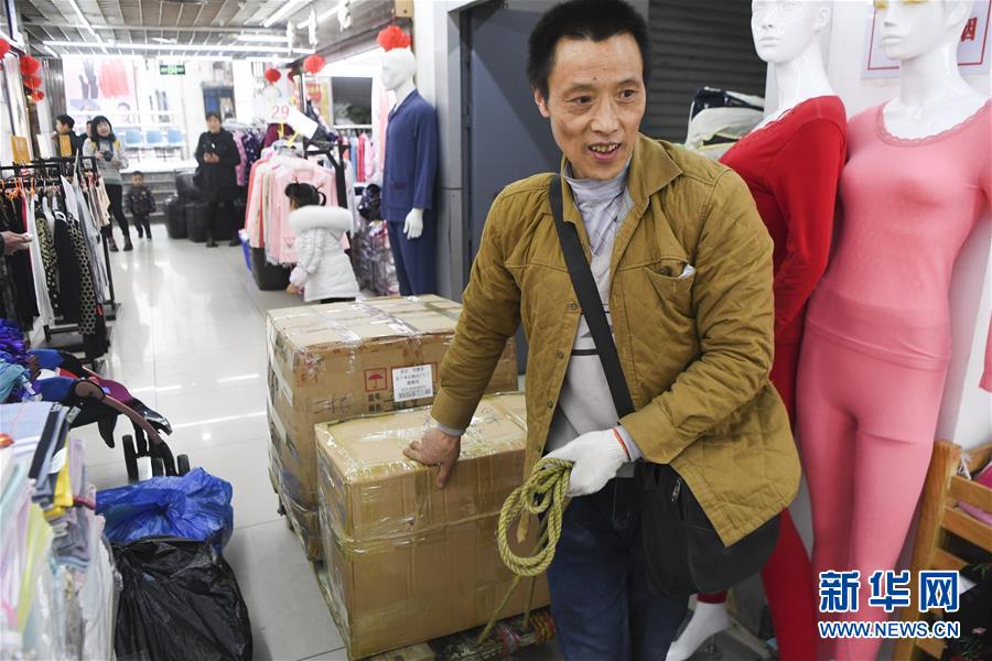 冉光輝在重慶朝天門大正商場內(nèi)搬運貨物(1月5日攝)。新華社記者王全超攝