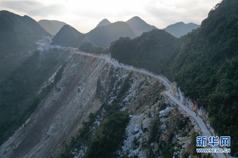 八好村駐村第一書記韋德王徒步前往弄麻屯開展扶貧工作,弄麻屯的公路尚在建設當中(2019年12月16日攝)。新華社記者黃孝邦攝