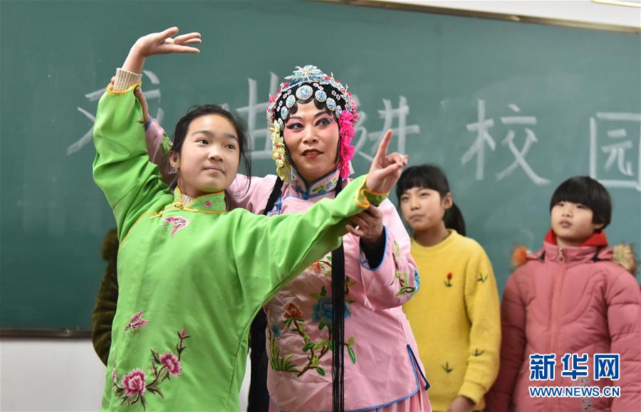 1月7日,定州市興定秧歌劇團演員在明月店鎮(zhèn)吳咬村小學指導學生練習戲曲表演基本功。 新華社記者 朱旭東 攝