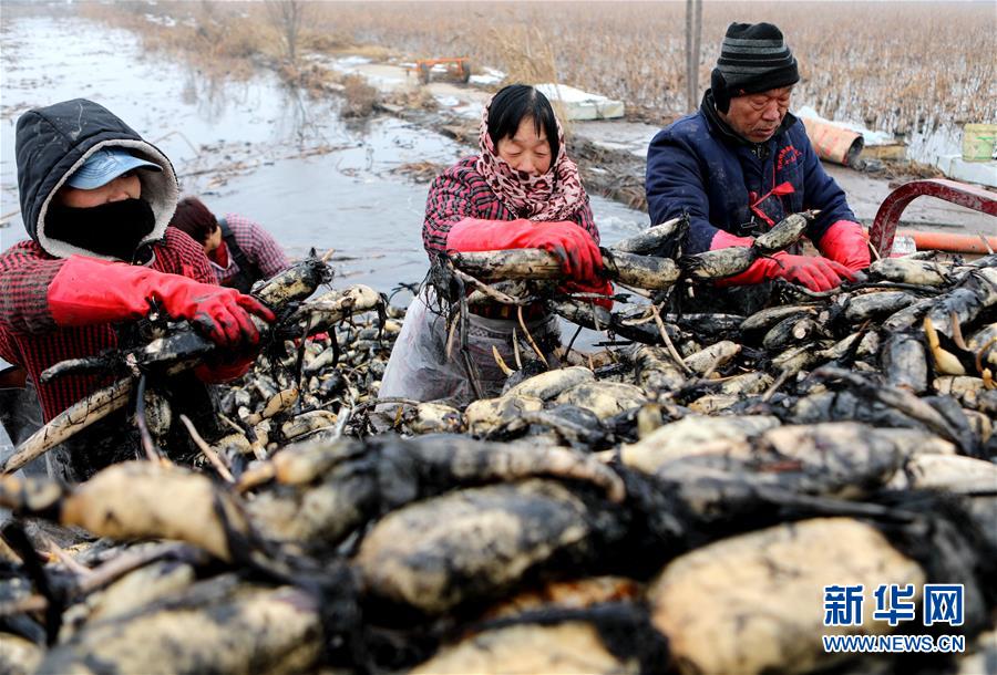 1月10日,村民在磁縣禾下土白蓮藕立體種養(yǎng)基地收獲蓮藕。 新華社記者 王曉 攝