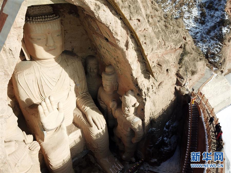 1月11日,游客在參觀天梯山石窟13號(hào)窟(無(wú)人機(jī)照片)。新華社記者馬寧攝
