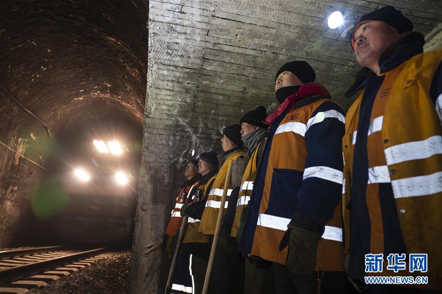 1月7日,在加格達奇工務段西羅奇嶺二號隧道,西羅奇維修工隊工作人員在避車洞內躲避列車。新華社記者才揚攝