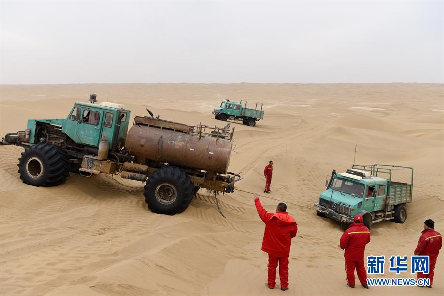 一輛測量作業(yè)車陷在沙坑中,水罐車進行營救(1月13日攝)。地球物理勘探是油氣開發(fā)的第一步,相當(dāng)于給地球做CT。物探工人按照嚴(yán)格的測線部署,在相應(yīng)位置鉆井,然后實施地震,采集地震波數(shù)據(jù)。科研人員通過數(shù)據(jù)組成的“CT片”,就能夠清晰地“看”到地下的地質(zhì)結(jié)構(gòu),判斷哪里埋藏有石油或者天然氣。2019年10月,東方地球物理勘探有限責(zé)任公司塔里木物探處2113隊進入新疆塔克拉瑪干沙漠腹地,開始中古14-21、塔中2兩個區(qū)塊的三維地震勘探。近2000名物探工人將在1000平方公里的范圍內(nèi)一直工作到2020年4月,這也意味著他們將在塔克拉瑪干沙漠腹地連續(xù)度過第14個除夕夜。蘊藏著豐富石油天然氣資源的新疆塔克拉瑪干沙漠有“死亡之?!敝Q,氣候干燥,年降水量在50毫米以下,冬季地表最低溫度超過零下30攝氏度,是世界油氣勘探難度最大的地區(qū)之一。為避開風(fēng)季,物探工人每年9、10月份進入沙漠,一直工作到來年4月,夜以繼日與黃沙、嚴(yán)寒為伴,用辛勤的汗水,為祖國找油找氣。新華社記者丁磊攝