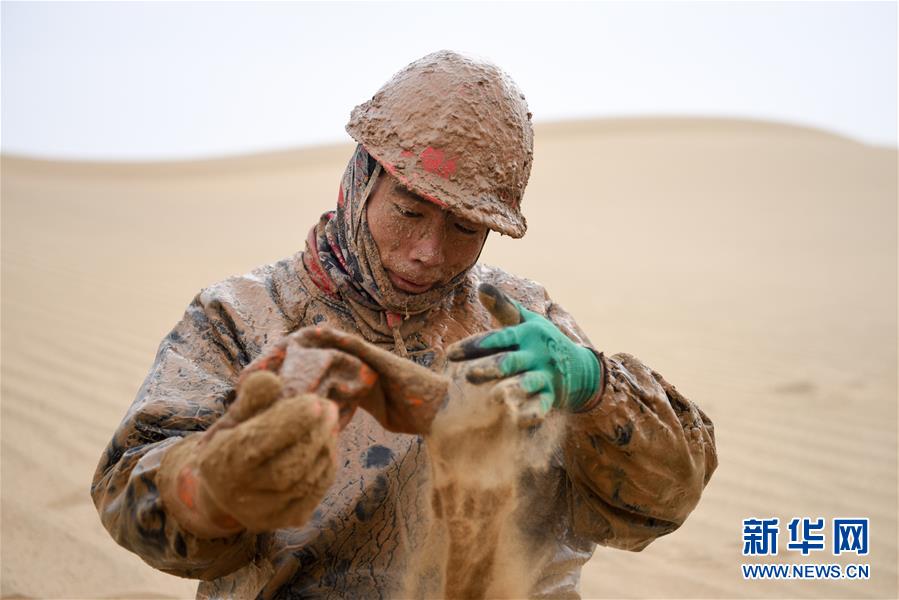 1月13日,鉆井工潘洪星用沙子帶出手套里的泥水。地球物理勘探是油氣開發(fā)的第一步,相當(dāng)于給地球做CT。物探工人按照嚴(yán)格的測線部署,在相應(yīng)位置鉆井,然后實施地震,采集地震波數(shù)據(jù)??蒲腥藛T通過數(shù)據(jù)組成的“CT片”,就能夠清晰地“看”到地下的地質(zhì)結(jié)構(gòu),判斷哪里埋藏有石油或者天然氣。2019年10月,東方地球物理勘探有限責(zé)任公司塔里木物探處2113隊進入新疆塔克拉瑪干沙漠腹地,開始中古14-21、塔中2兩個區(qū)塊的三維地震勘探。近2000名物探工人將在1000平方公里的范圍內(nèi)一直工作到2020年4月,這也意味著他們將在塔克拉瑪干沙漠腹地連續(xù)度過第14個除夕夜。蘊藏著豐富石油天然氣資源的新疆塔克拉瑪干沙漠有“死亡之?!敝Q,氣候干燥,年降水量在50毫米以下,冬季地表最低溫度超過零下30攝氏度,是世界油氣勘探難度最大的地區(qū)之一。為避開風(fēng)季,物探工人每年9、10月份進入沙漠,一直工作到來年4月,夜以繼日與黃沙、嚴(yán)寒為伴,用辛勤的汗水,為祖國找油找氣。新華社記者丁磊攝