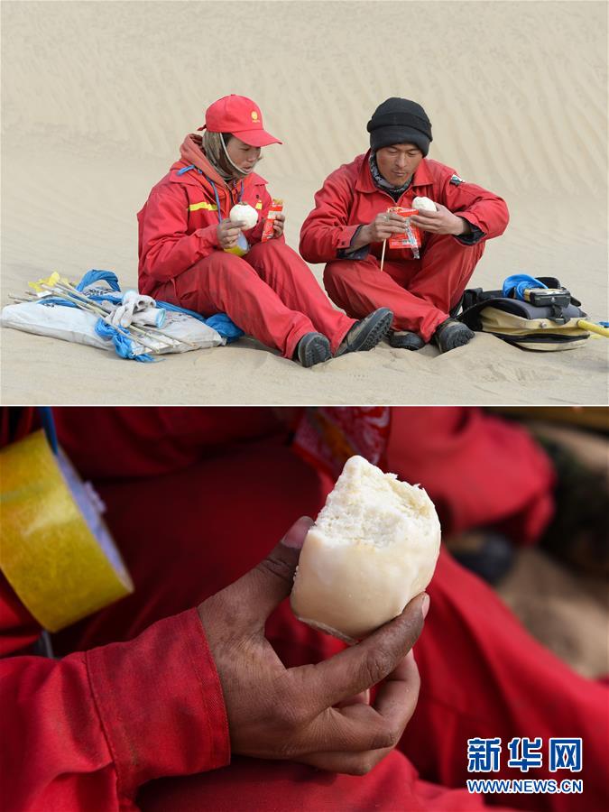 這是一張拼版圖片:上圖為測量工周國燕(左)和丈夫杞朝金在沙漠中解決午餐(1月13日攝);下圖為測量工周國燕在吃冰涼的饅頭(1月13日攝)。地球物理勘探是油氣開發(fā)的第一步,相當(dāng)于給地球做CT。物探工人按照嚴(yán)格的測線部署,在相應(yīng)位置鉆井,然后實施地震,采集地震波數(shù)據(jù)??蒲腥藛T通過數(shù)據(jù)組成的“CT片”,就能夠清晰地“看”到地下的地質(zhì)結(jié)構(gòu),判斷哪里埋藏有石油或者天然氣。2019年10月,東方地球物理勘探有限責(zé)任公司塔里木物探處2113隊進入新疆塔克拉瑪干沙漠腹地,開始中古14-21、塔中2兩個區(qū)塊的三維地震勘探。近2000名物探工人將在1000平方公里的范圍內(nèi)一直工作到2020年4月,這也意味著他們將在塔克拉瑪干沙漠腹地連續(xù)度過第14個除夕夜。蘊藏著豐富石油天然氣資源的新疆塔克拉瑪干沙漠有“死亡之海”之稱,氣候干燥,年降水量在50毫米以下,冬季地表最低溫度超過零下30攝氏度,是世界油氣勘探難度最大的地區(qū)之一。為避開風(fēng)季,物探工人每年9、10月份進入沙漠,一直工作到來年4月,夜以繼日與黃沙、嚴(yán)寒為伴,用辛勤的汗水,為祖國找油找氣。新華社記者丁磊攝