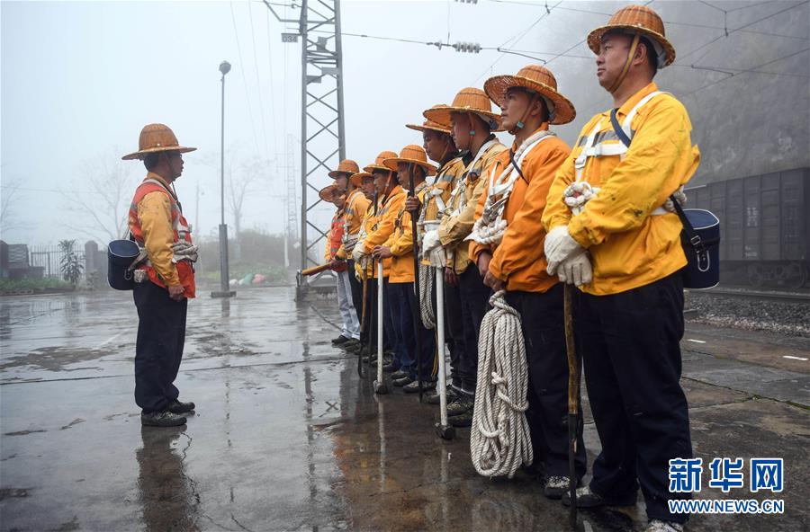 1月14日,百色工務(wù)段白水河橋隧工區(qū)班組工長王勇(左一)在出發(fā)前向班組成員講解注意事項。在中國鐵路南寧局集團(tuán)公司百色工務(wù)段白水河橋隧工區(qū),有一個由14名工人組成的班組。他們常年像“爬山虎”一樣行走攀爬在地形險峻、云霧繚繞的高山上,負(fù)責(zé)南昆鐵路轄區(qū)路段的搜山掃石工作,清除一切可能危害鐵路行車安全的因素,保障旅客出行安全。新華社記者張愛林?jǐn)z