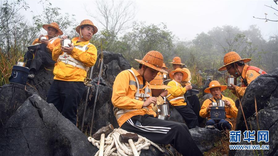 1月14日,百色工務(wù)段白水河橋隧工區(qū)班組成員在工作間隙吃午飯。在中國鐵路南寧局集團(tuán)公司百色工務(wù)段白水河橋隧工區(qū),有一個由14名工人組成的班組。他們常年像“爬山虎”一樣行走攀爬在地形險峻、云霧繚繞的高山上,負(fù)責(zé)南昆鐵路轄區(qū)路段的搜山掃石工作,清除一切可能危害鐵路行車安全的因素,保障旅客出行安全。新華社記者張愛林?jǐn)z
