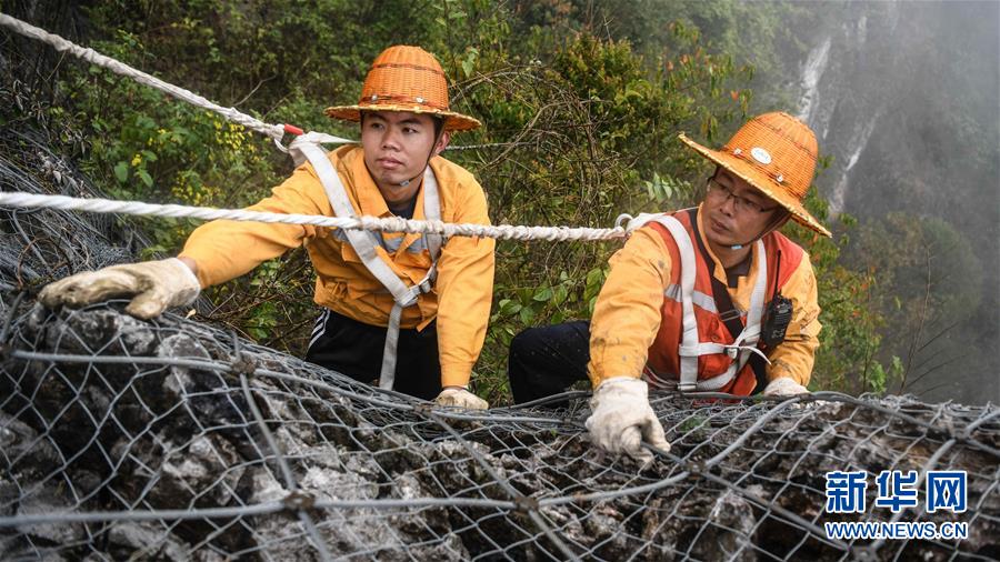 1月14日,百色工務(wù)段白水河橋隧工區(qū)班組工長王勇(右一)和同事在處理危石。在中國鐵路南寧局集團(tuán)公司百色工務(wù)段白水河橋隧工區(qū),有一個由14名工人組成的班組。他們常年像“爬山虎”一樣行走攀爬在地形險峻、云霧繚繞的高山上,負(fù)責(zé)南昆鐵路轄區(qū)路段的搜山掃石工作,清除一切可能危害鐵路行車安全的因素,保障旅客出行安全。新華社記者張愛林?jǐn)z