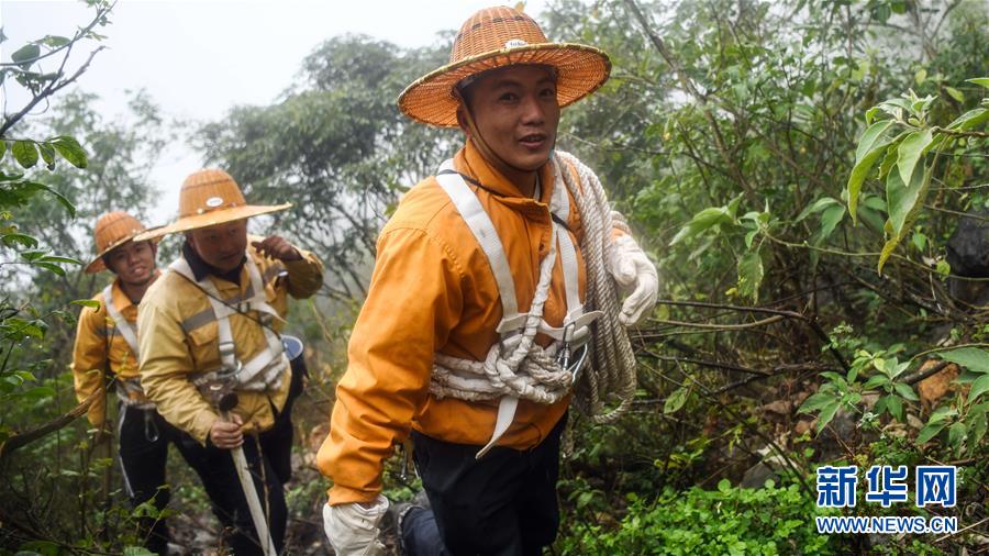 1月14日,百色工務(wù)段白水河橋隧工區(qū)班組工長王勇(中)在穿戴安全裝備,準(zhǔn)備下山崖巡查。在中國鐵路南寧局集團(tuán)公司百色工務(wù)段白水河橋隧工區(qū),有一個由14名工人組成的班組。他們常年像“爬山虎”一樣行走攀爬在地形險峻、云霧繚繞的高山上,負(fù)責(zé)南昆鐵路轄區(qū)路段的搜山掃石工作,清除一切可能危害鐵路行車安全的因素,保障旅客出行安全。新華社記者張愛林?jǐn)z
