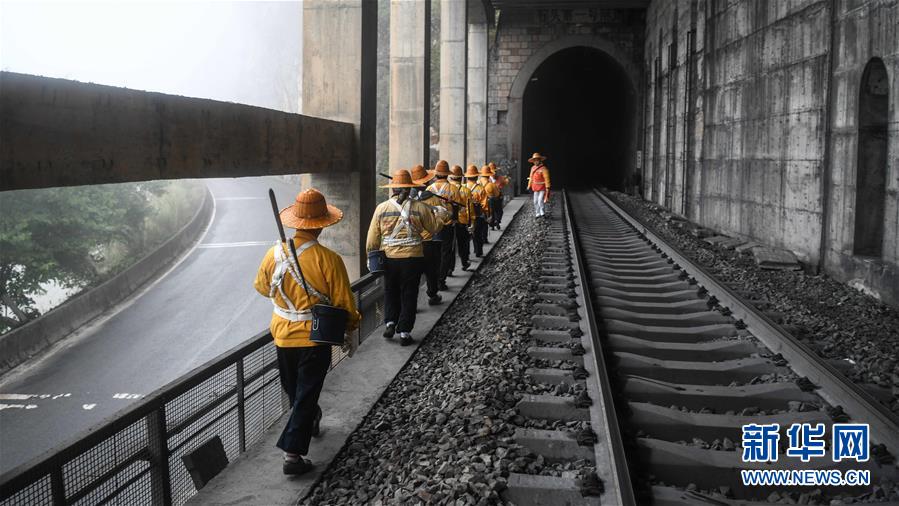1月14日,百色工務(wù)段白水河橋隧工區(qū)班組成員開展巡查工作。在中國鐵路南寧局集團(tuán)公司百色工務(wù)段白水河橋隧工區(qū),有一個由14名工人組成的班組。他們常年像“爬山虎”一樣行走攀爬在地形險峻、云霧繚繞的高山上,負(fù)責(zé)南昆鐵路轄區(qū)路段的搜山掃石工作,清除一切可能危害鐵路行車安全的因素,保障旅客出行安全。新華社記者張愛林?jǐn)z