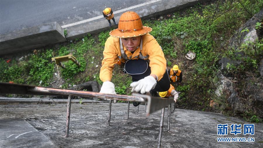1月14日,百色工務段白水河橋隧工區(qū)班組成員攀梯上山開展巡查工作。在中國鐵路南寧局集團公司百色工務段白水河橋隧工區(qū),有一個由14名工人組成的班組。他們常年像“爬山虎”一樣行走攀爬在地形險峻、云霧繚繞的高山上,負責南昆鐵路轄區(qū)路段的搜山掃石工作,清除一切可能危害鐵路行車安全的因素,保障旅客出行安全。新華社記者張愛林攝