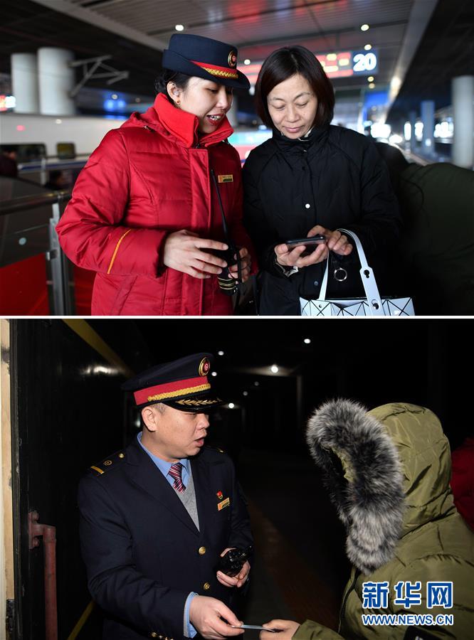 拼版照片上圖:在西安北站,列車長陳海燕(左)幫助旅客在手機上購買火車票(新華社記者詹彥1月11日攝);下圖:在陽泉北站,列車長趙耀(左)為旅客檢票(新華社記者楊晨光1月11日攝)。新華社發(fā)