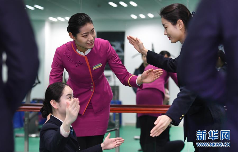 吉如(后左一)在車站職工活動室指導同事禮儀訓練(1月15日攝)。 新華社記者 陶明 攝