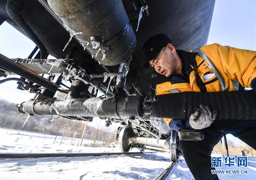 林海間的“送水小火車” 調(diào)車員對(duì)“送水小火車”進(jìn)行出行前的檢查作業(yè)(1月17日攝)。新華社記者 許暢 攝