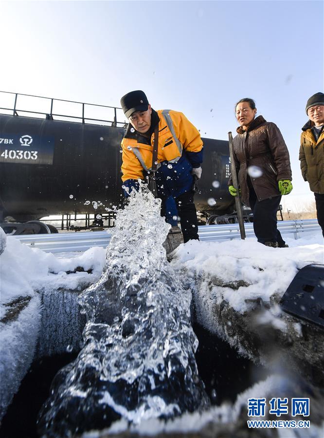 送水員黃衛(wèi)東調(diào)整輸水管位置,將水注入火炬溝乘降點(diǎn)的蓄水井內(nèi)(1月17日攝)。新華社記者 許暢 攝