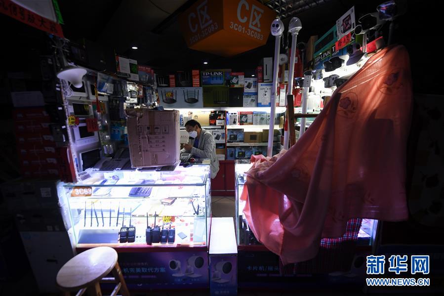 2月24日,在深圳華強(qiáng)北暫未完全開(kāi)放的賽格電子市場(chǎng)里,商戶(hù)在與客戶(hù)打電話(huà)。 新華社記者 毛思倩 攝