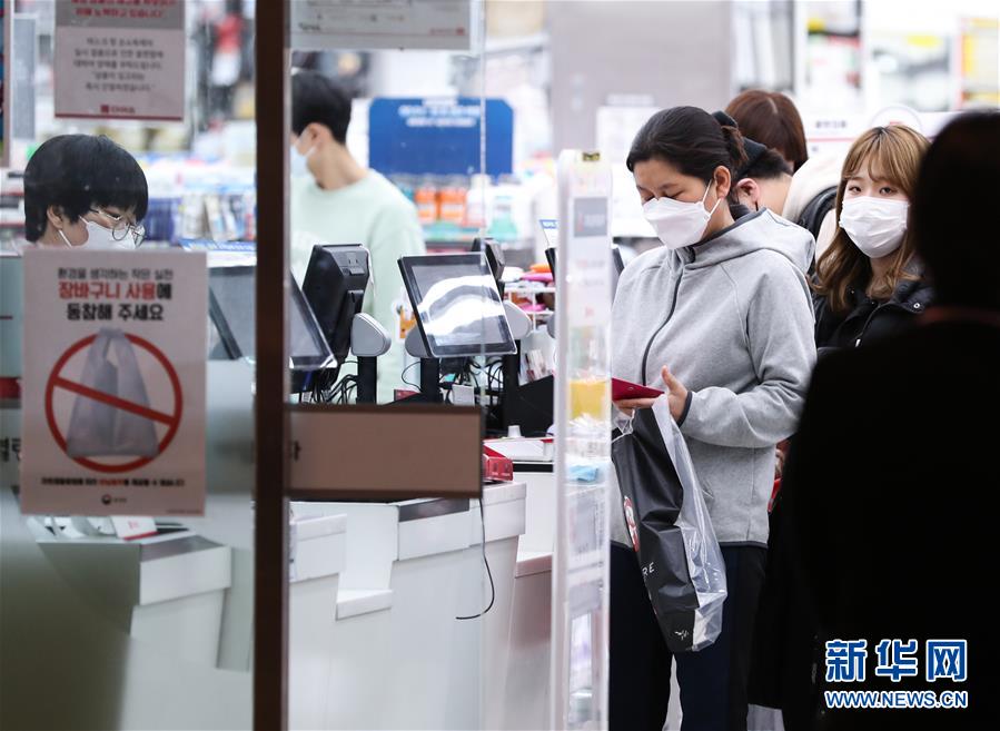 2月24日,在韓國首爾,當地居民在龍山區(qū)一家日用品商店排隊結賬。 新華社記者 王婧嬙 攝