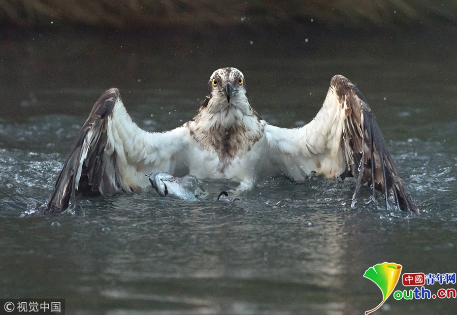 一只魚鷹潛入湖中捉鱒魚,激起巨大的水花。圖片作者/視覺(jué)中國(guó)