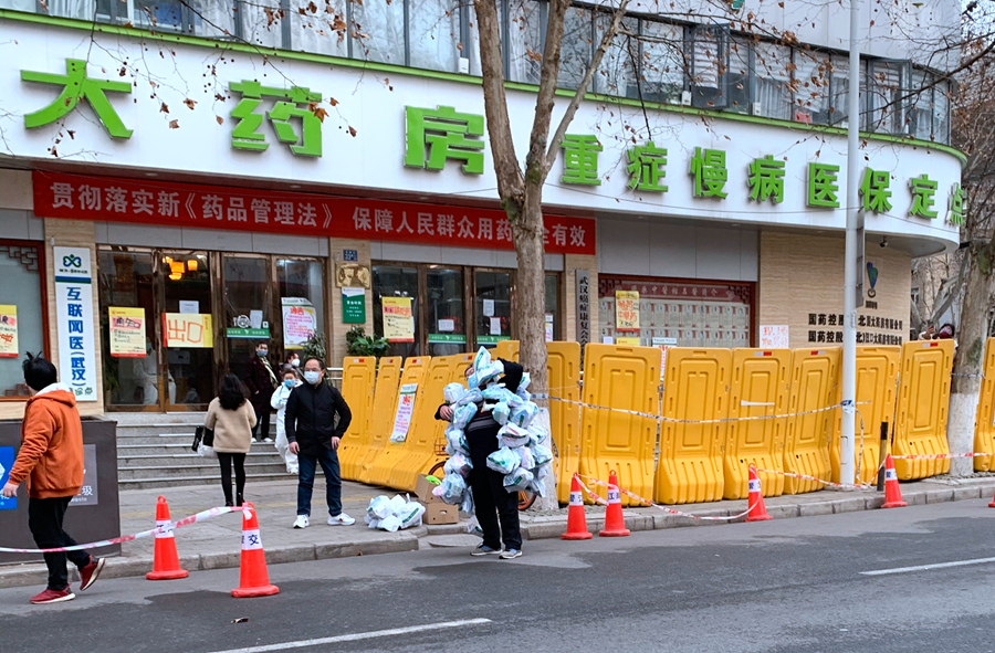 2月22日,王春波從藥店出發(fā),給周邊小區(qū)的居民送藥。新冠肺炎疫情防控工作啟動以來,在決戰(zhàn)之地武漢,有一群“平民英雄”默默付出鮮為人知。他們雖不是醫(yī)護人員,但也活躍在城市抗擊疫情的各個戰(zhàn)線上,力所能及地幫助他人,義無反顧的堅守自己的“戰(zhàn)場”,為抗擊疫情加油助力。近日,記者走近這群“平民英雄”,用鏡頭記錄下他們不平凡的身影。新華社記者熊琦攝