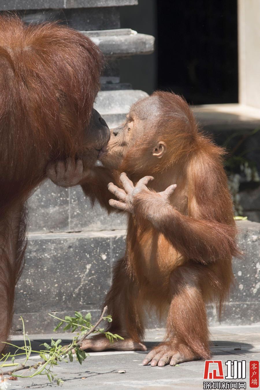 當時三歲的 Berani正獨自在戶外玩耍,不一會它的媽媽 Sari就找來了,一把拖著娃從草地上回到家門口,然后立刻送上擁抱和親吻,原來猩媽媽是想孩子了呀!