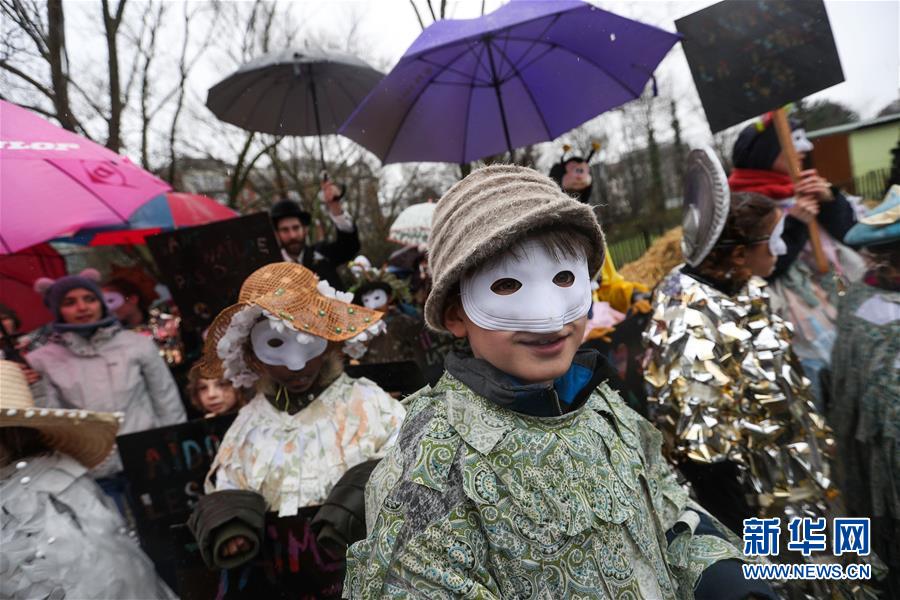 2月27日,兒童在比利時布魯塞爾參加狂歡節(jié)活動。 新華社記者鄭煥松攝