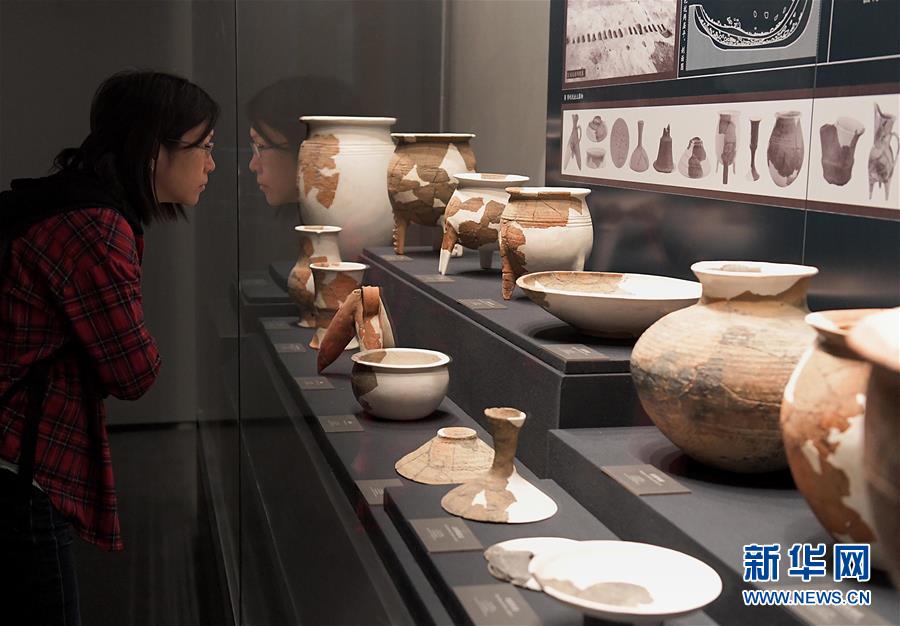 參觀(guān)者在二里頭夏都遺址博物館觀(guān)看展出的陶器(2019年10月19日攝)。新華社記者李安攝
