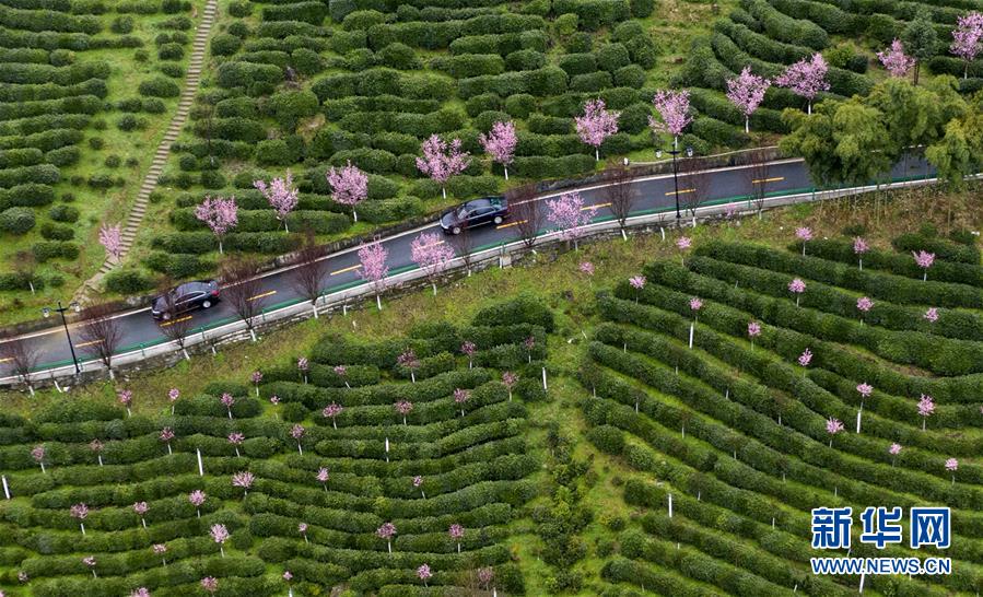 這是3月2日拍攝的平利縣長(zhǎng)安鎮(zhèn)洪福茶山,道路兩旁的春梅盛開(無人機(jī)照片)。新華社記者陶明攝